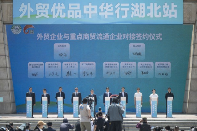 4月26日正在启动典礼现场拍摄的外贸企业取沉点商贸畅通企业对接签约典礼。当日,外贸优品中华行湖北坐暨“乐购湖北”消费季勾当正在武汉市汉口北国际商业城启动。记者 伍志卑 摄?。